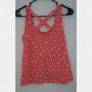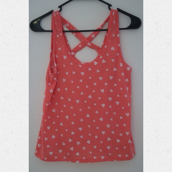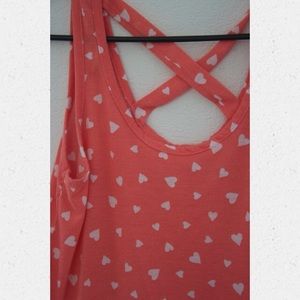 Salmon colored cross-back tank top with heart pattern.