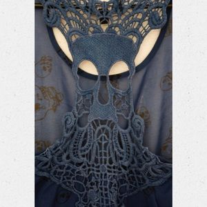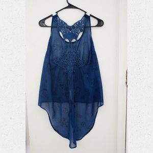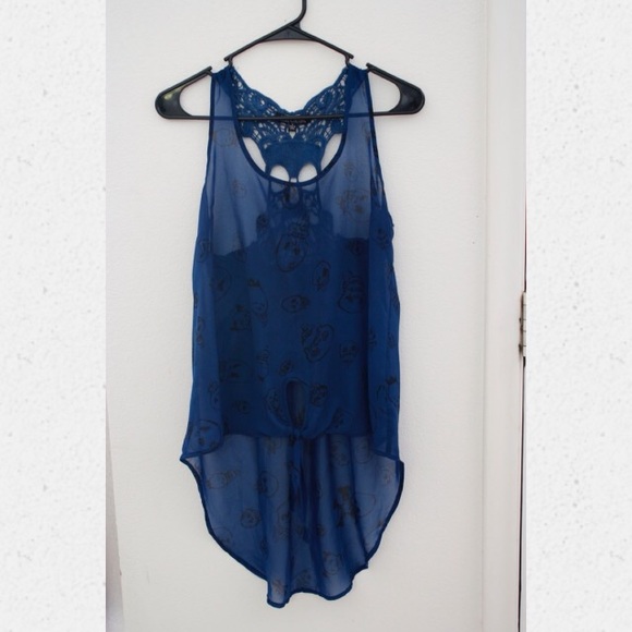Sheer blue tank top with skull pattern. Shorter in the front, longer in the back. Crochet pattern on back. Like-new condition.