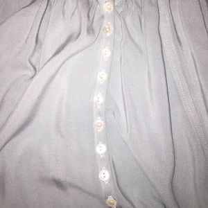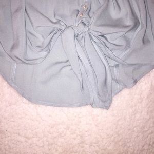 This is a blue/gray colored top. It looks super cute with jeans. It ties up at the end and has 3/4 length sleves.