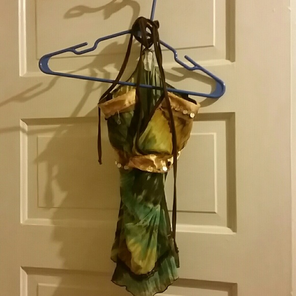 Very cute, tye dye with gold bedazzle. Bottom is sheer. Ties around nexk with wooden circle on back
