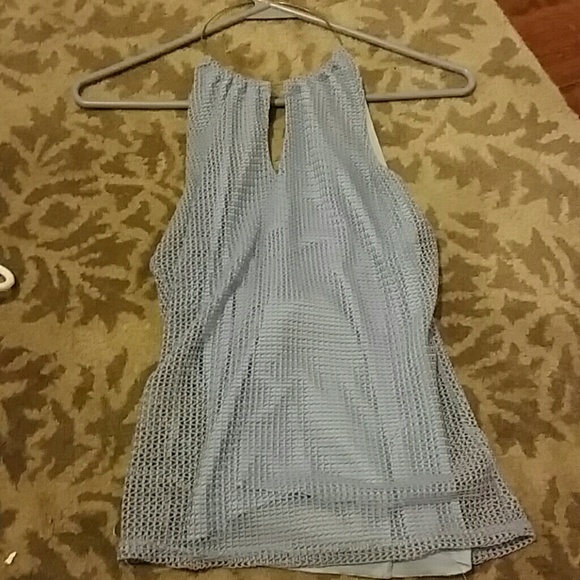 Light blue. Outside is a see through neeting, the inside is a silky solid. The neck line is high, then has a slit down. There is a metal ring that goes around the neck