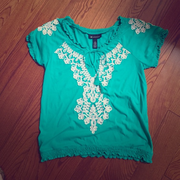 Green INC top with drawstring neckline elastic gathering on sleeves and waist. While design with rhinestones Worn twice