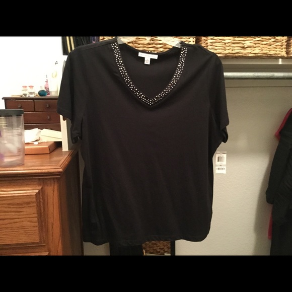 Black with decorative beading around V-neck. Never worn. JM Collection brand.