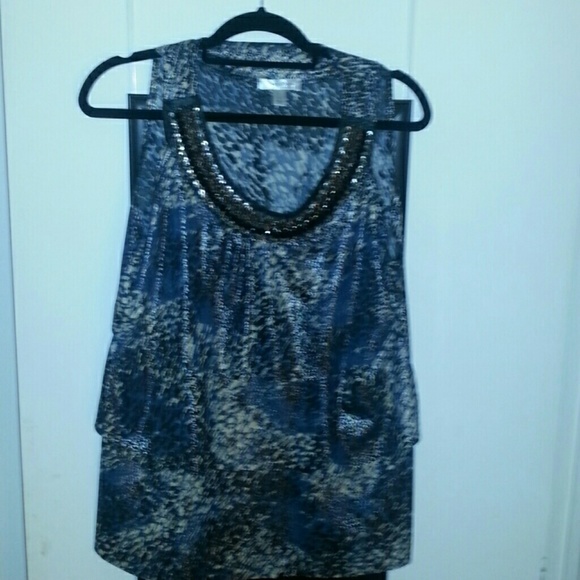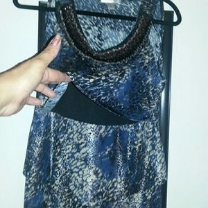 Its a metallic blue with a couple of layers, very light it has a beautiful look alike collar attached, no sleeves and it either can be paired with jeans or a skirt...