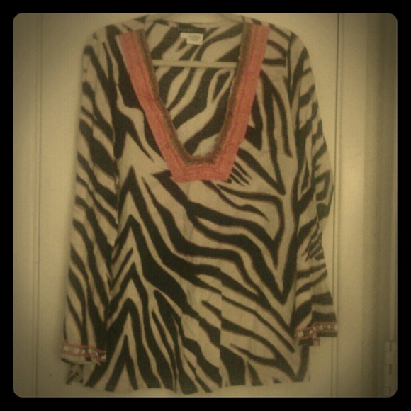 Zebra print with a beaded square neckline. Long sleeves with beads at the bottom. Slits on each side. Casual and fun!