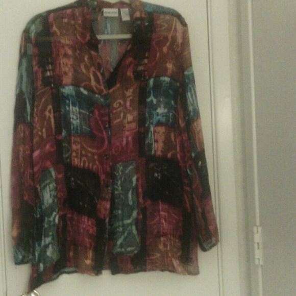 Sheer button down collared blouse with belled long sleeves. Slits on each side. A few buttons missing but easy to replace and make it your own. Very colorful and versatile.