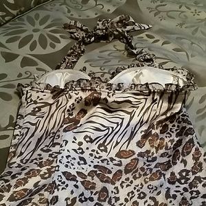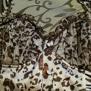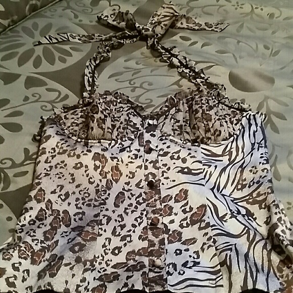 Cute halter top with zipper up this side and ruffles on the tie. Leopard print. Silky material. Never has been worn. Excellent for party night. Built in bra.