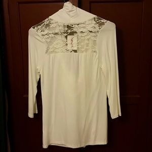 White t shirt material crosses over in the front with pretty lace on shoulders and in the back never been worn tags still attached