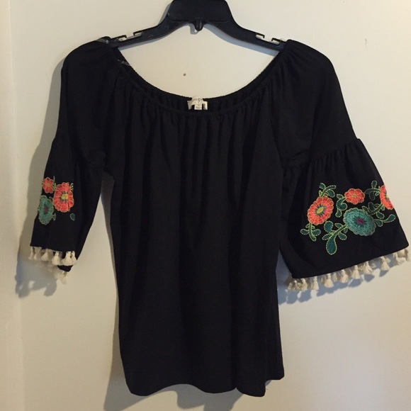 Black top with an elastic neckline. It can be worn on or off the shoulder. Super cute embroidery detail. Never been worn.