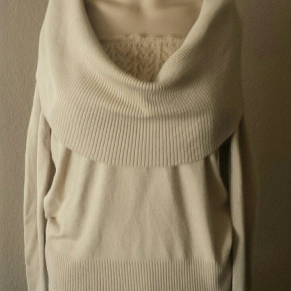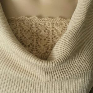 Georgous sweater. Wear on shoulder. Attached lace design under cowl neck. Acrylic and Nylon. Sweater is fairly lightweight. Good for Spring, Winter and Fall.