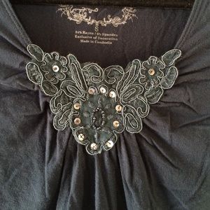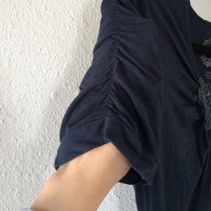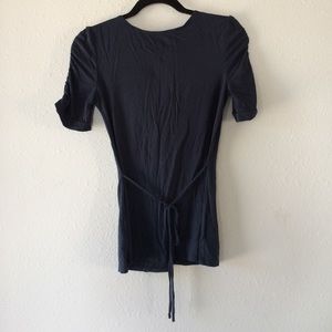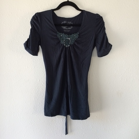I couldn't get a picture that showed its true color but it's more like an indigo blue colored top. It has really pretty detail at the front and on the sleeves, which are a tad longer than normal sized sleeves. It also ties in the back which cinched the waist flatteringly. Bundles available ✨