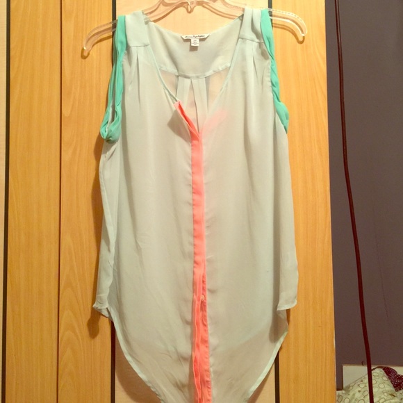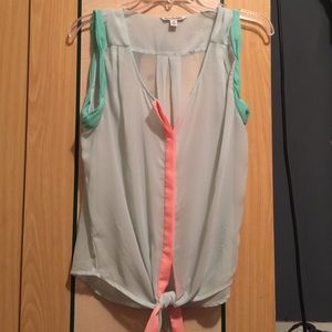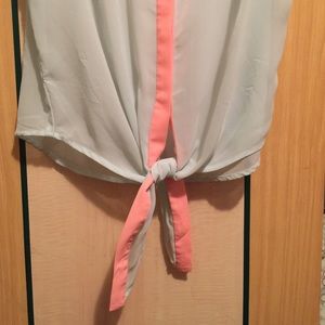 This an American eagle spring shirt, it's nice and light,a sleeveless button up,colors are aqua and pink , and can be tied at the bottom, size medium 😉