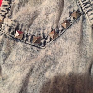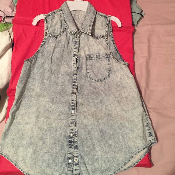 This is a denim sleeves shirt, light denim/tie dye blue. With studs on chest,button up, size medium with a pocket on the left side. 😊