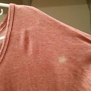 Soft pink/coral three-quarter sleeve. Can be fitted or loose and flowy on a size small. (It's a large) has dime size bleach stain on left shoulder. Otherwise great condition.
