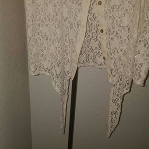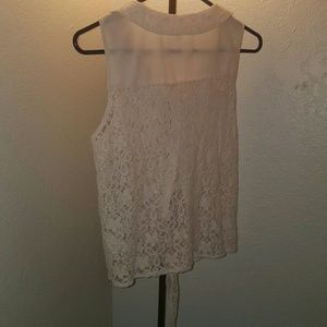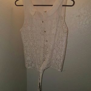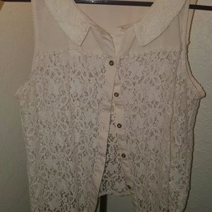 White, sheer lace, gold button-up top. Sleeveless, with a lace collar. Also has ties on bottom to tie or to not tie.