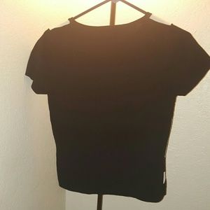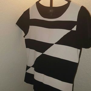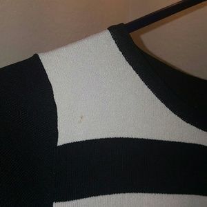 Black and white designed top, with just black on the back. Thicker type of material of shirt, with a small stain as seen in last picture.