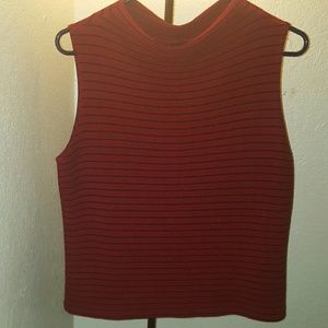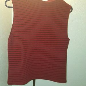 Red with black stripes top. Sleeveless with a somewhat collared neck.