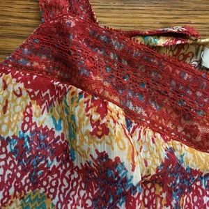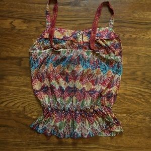 Multicolored, lite and cool summer top. 100% polyester. Elastic around bottom, buttons up the front. Straps in back have buttons so you can adjust them to fit.