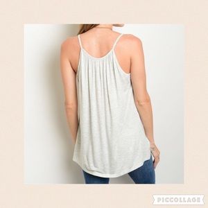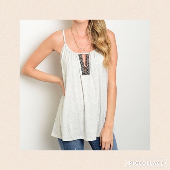 Beautiful spaghetti strap top. Light gray color with black detail on the front side. Super cute with skinny jeans or cut off shorts! 95% Viscose 5% Spandex