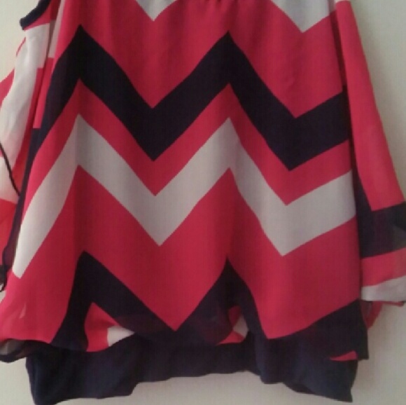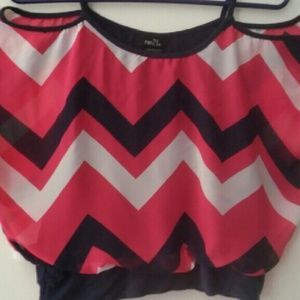 Sheer overlay, attached tank top. Exposed shoulder. Pinkish/Red color, not a bold red in zig zag.