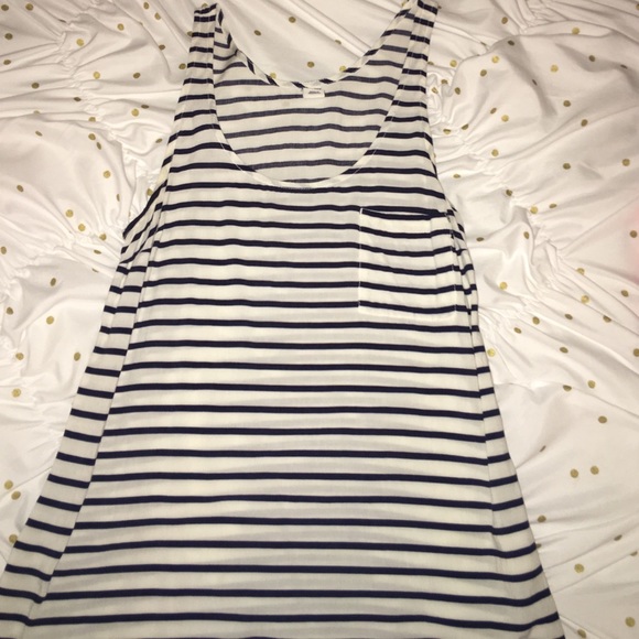 White and navy blue striped top, with pocket on the side. Tight fitting