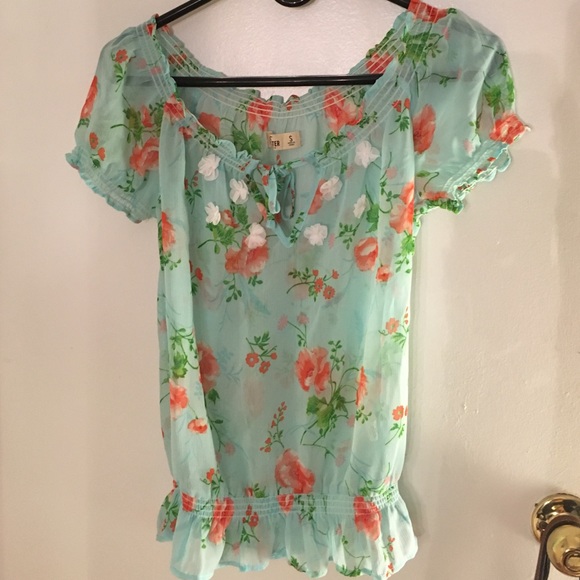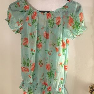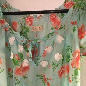Love love love the color of this shirt! Baby blue with salmon color florals, white flowers on the chest area