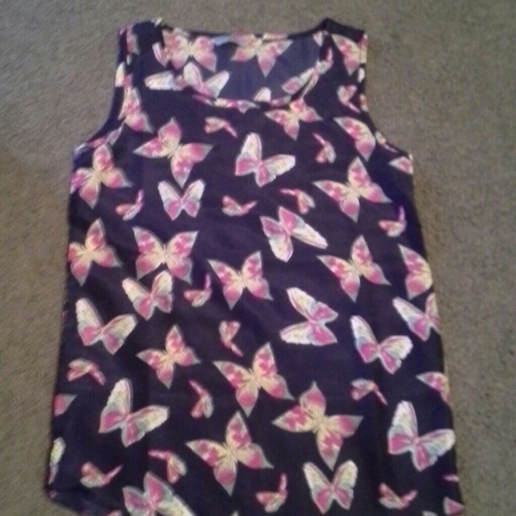 Silk top with butterflies. Never worn. Runs small. Probably a xsmall. Very comfy.