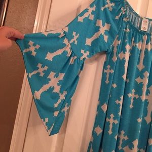 Cute flowy top with oversized sleeves. Stylish white crosses over turquoise base print. Only worn a few times. Purchased at a rodeo boutique.