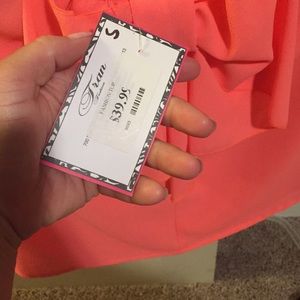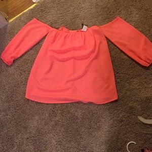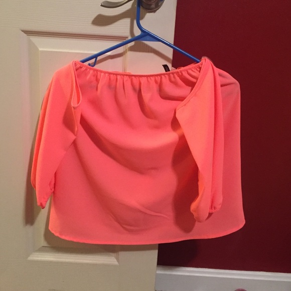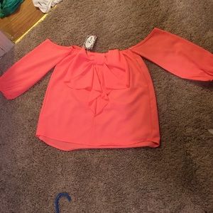Neon pink flowy top. Bow in the back of the shirt. Never worn, sleeves are quarter length and shirt is made to sit off of your shoulders.