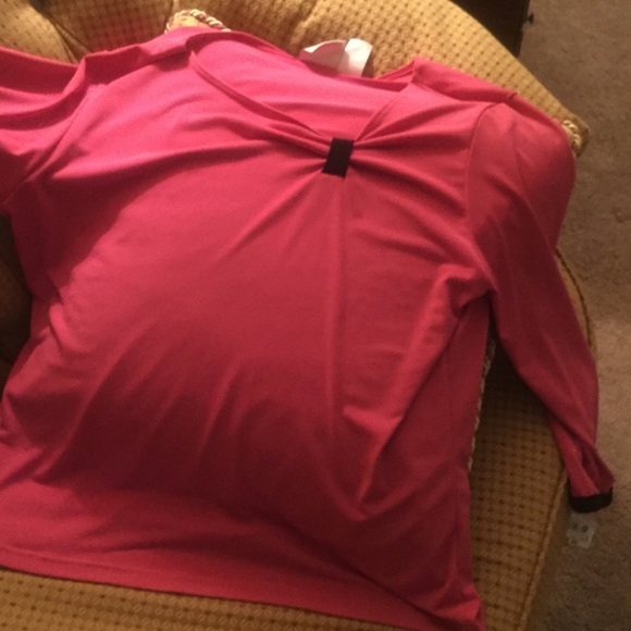 3/4 sleeve hot pink ,trimmed in black. Material does give a little.
