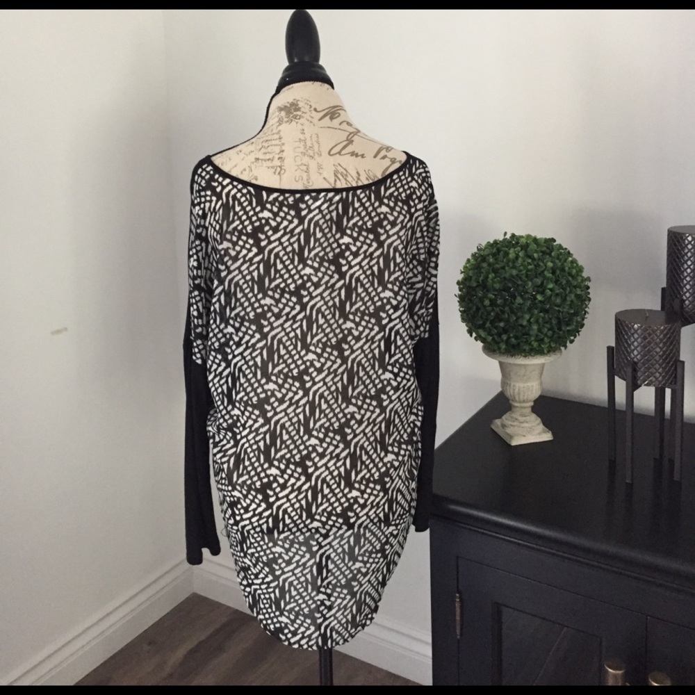 Solid black front with black and white pattern on the back. Scoop neck line. Slim fitted sleeves.