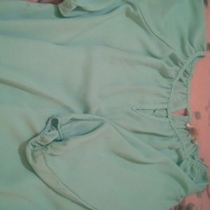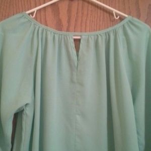 Beautiful green pastel colored silky blouse. Cut out in fron and back neck with fitted wrist that flow. So pretty and feminine. No size fits S To M.