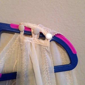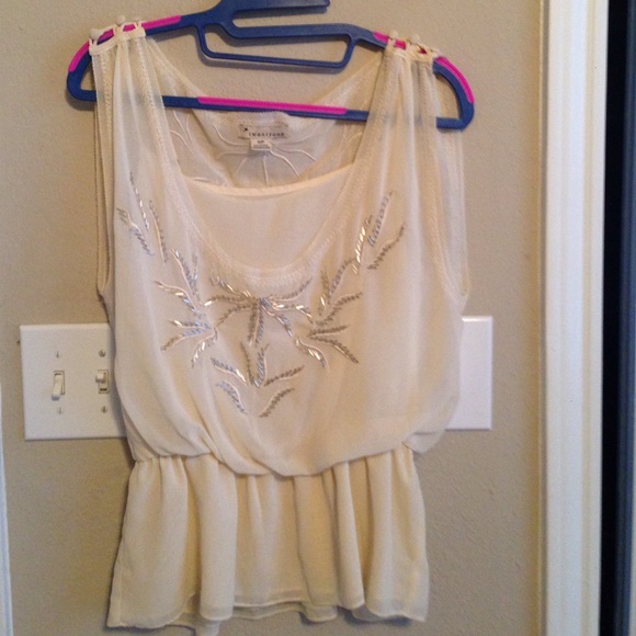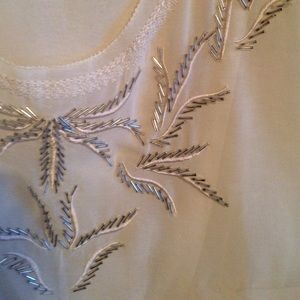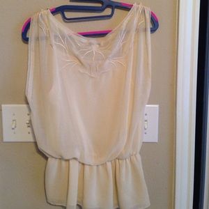 Sheer cream top cinched at waist and flows. Beaded decoration. One button on each side replaced. See picture of replaced button (replaced on the same spot on the left side).