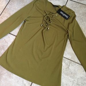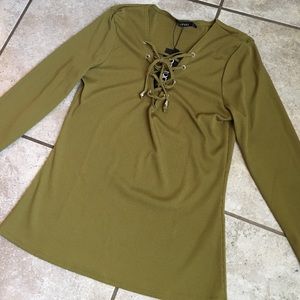 Long sleeve, lace-up top. Olive color. New with tag. Medium size, but stretching material.