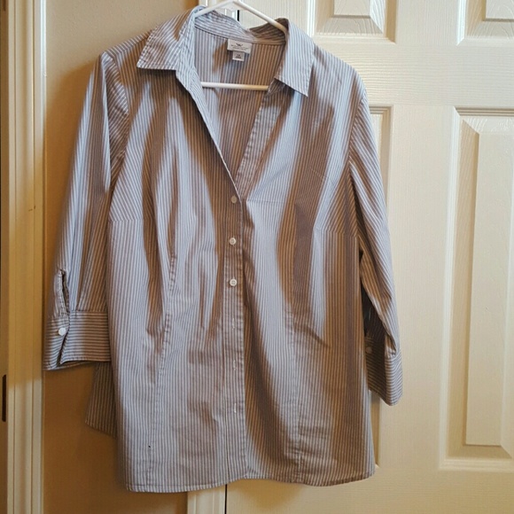 Grey white pin stipe 3/4 in sleeves. No signs of wear. Dressy blouse with right accessories