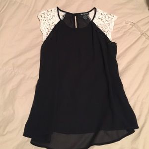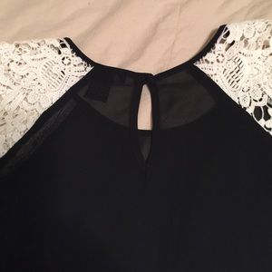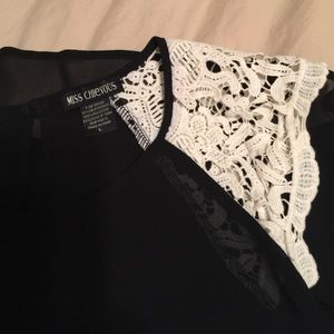 Undeniably feminine. This juniors' Miss Chievous top is fresh, fun and fashionable. Short sleeve high low shirt with lace detail on the sleeve. 100% polyester exclusive of trim. Partially See through. Size Junior Large. It fits a size M in women's size. Like new.