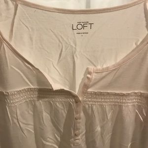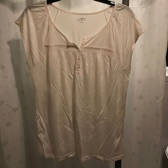 Cap sleeve top in off white. Ruffle detail at breast with V slit neck. Very soft and silky. Worn once