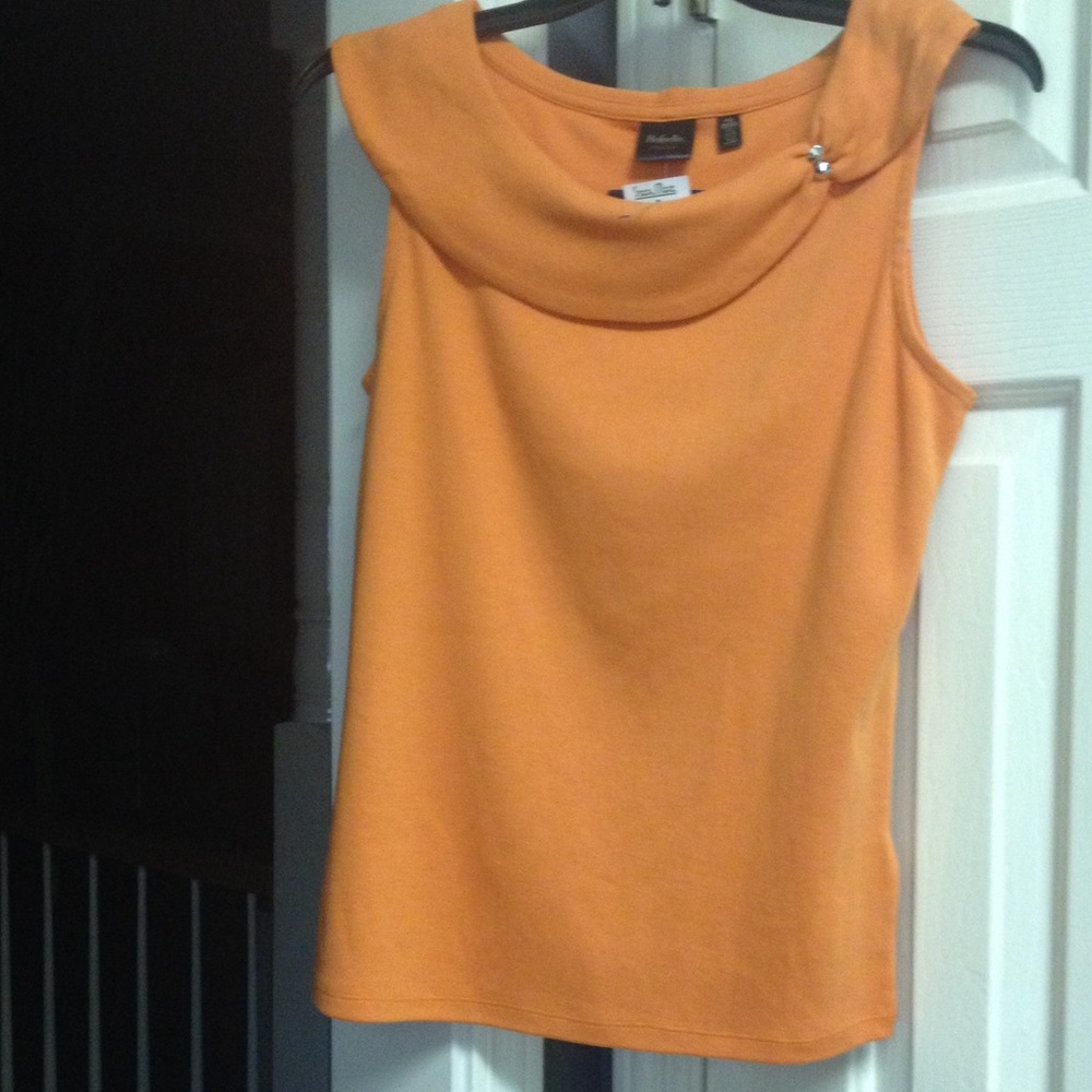 Orange sleeveless knit top with silver accent at left shoulder