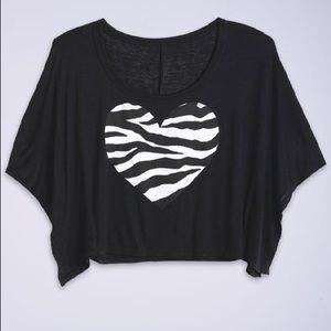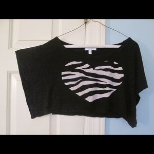 Crop top. Zebra print heart. I was literally obsessed with this shirt! I'd wear it all the time! It's in perfect condition still! I can't remember the exact original price because I got it so long ago, but I think it was $30. I just remember telling my mom I really wanted it but didn't want to buy it myself because it was too expensive for me.