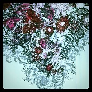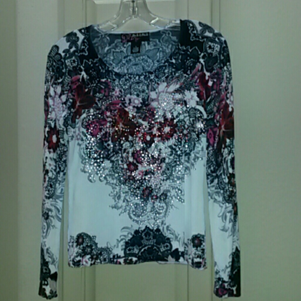 70% Rayon,15% Nylon, 15% Spandex, Hand wash, Dry flat, Floral with rhinestone embellishments