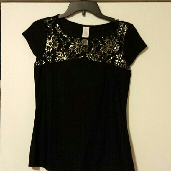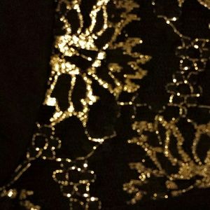 Black with gold flower detail. Never worn. The section with the gold flowers is see through.