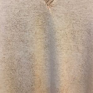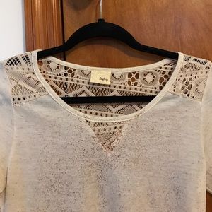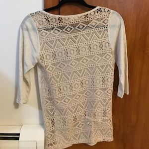 Three-quarter length cream shirt with gold specks on it. Small lace details on front and all of back is open lace.