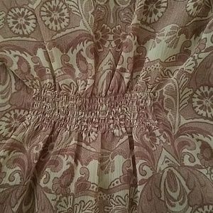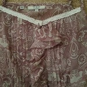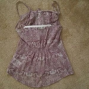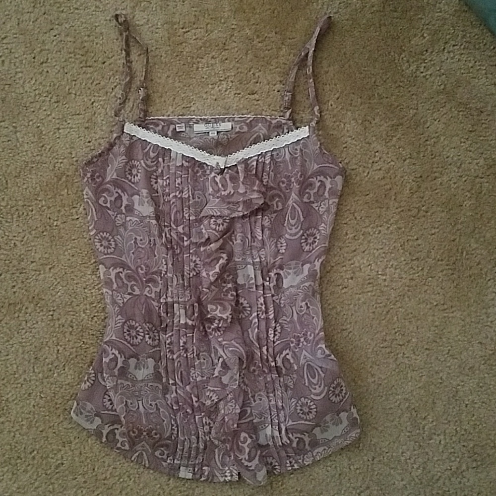 Tank top with ruffles in the center and creases going down the center. There is also stitching in the center on the back side of the top to fit to your body.