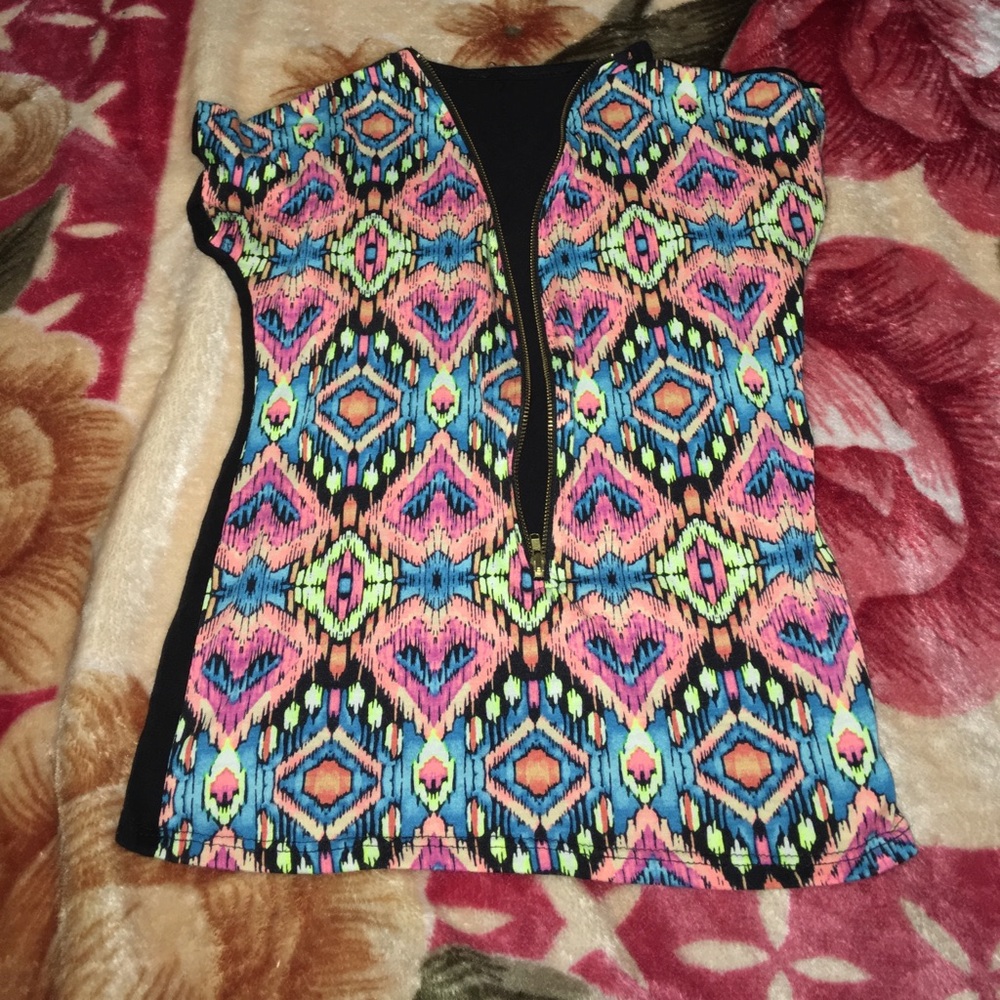 This top is included with the middle zipper show you can bring down the zipper and put it back up and also has a cute design on the front and the simple black design on the back
