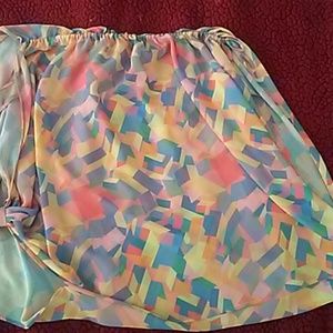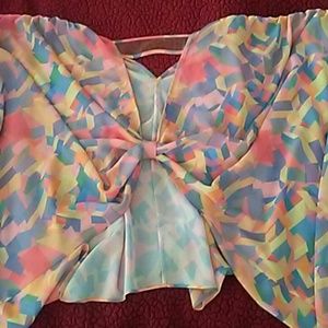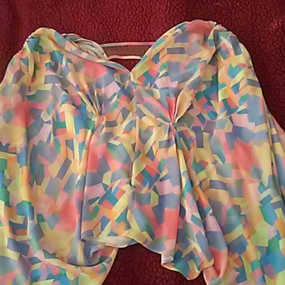 Very pretty lightweight spring color top! Third photo is shirt to sleeve area. It has a butterfly look. Back mostly open. Multi-colors of yellow, blue, green, pink, corral.
