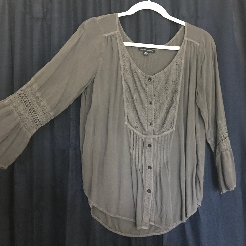 Never worn. 3/4 length sleeves with a sort of mesh netting on the forearm of the sleeve. Buttons are for the look. Back is flowy. It's a blue gray color.