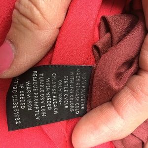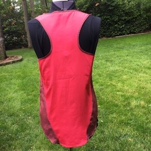 Tank racer back top 100% polyester reddish orange with copper brown accent trim at neck, arm and sides. Picture reflects true color in natural lighting, great summer top without flaws.