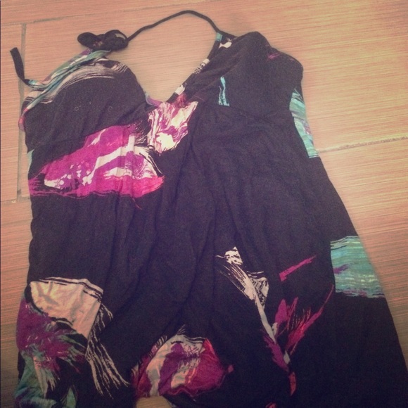 Black white strap around neck has some purple and white and blue to it