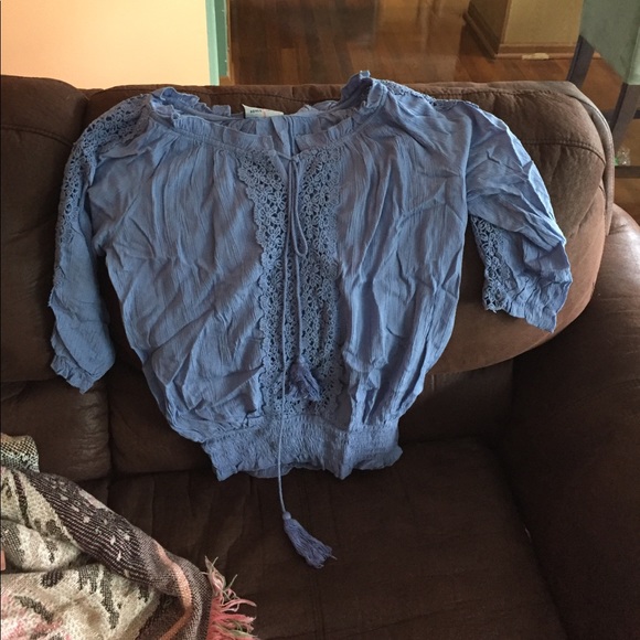 Blue peasant style top with lace embroidery