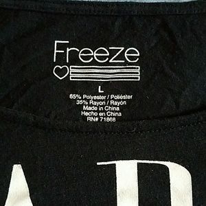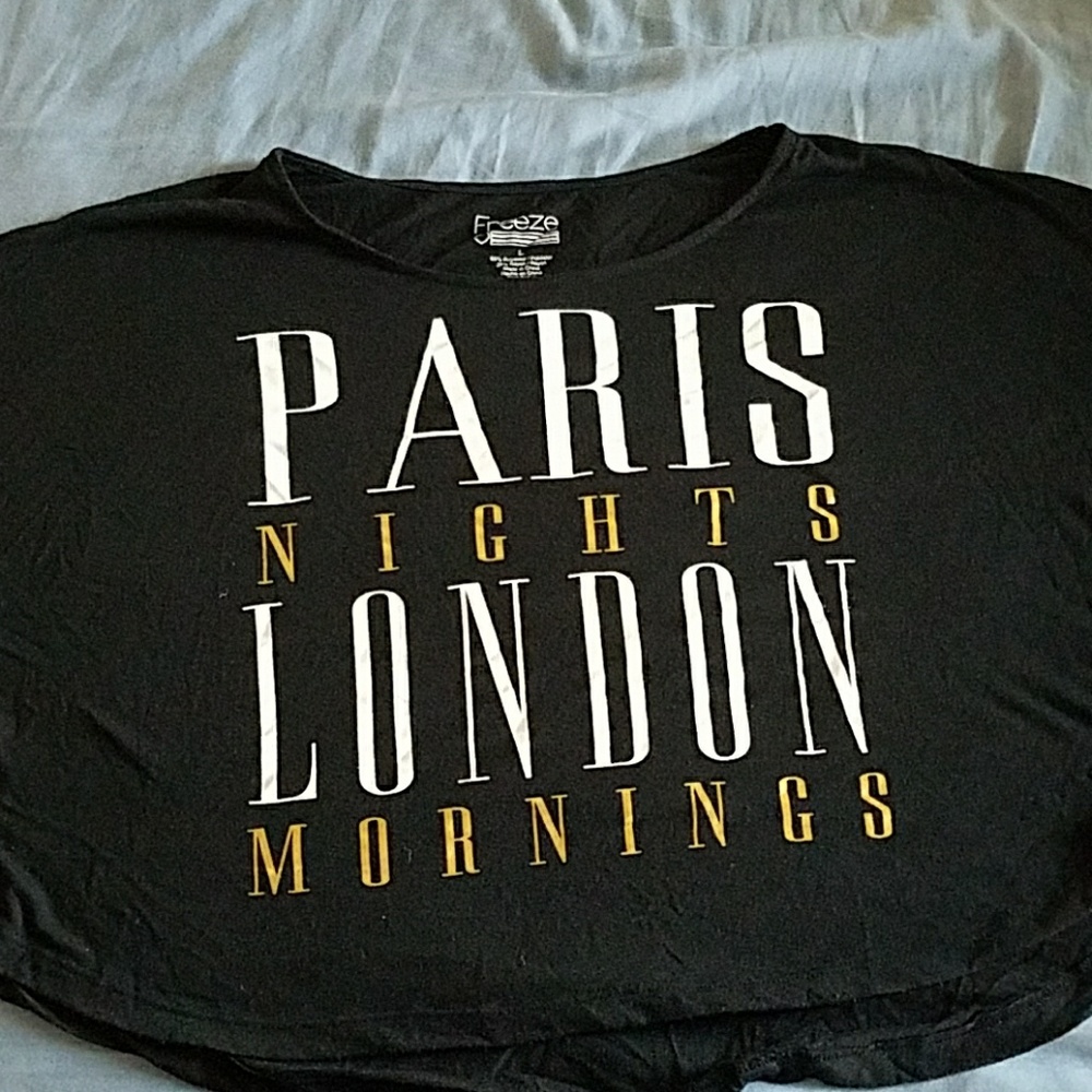 Black woman's top. Short in front, longer in the back. Mid length sleeves.